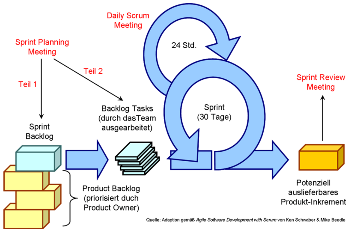 Ist ein festgelegter Zeitrahmen von einem bis vier Wochen, in dem das Scrum-Team ein potenziell auslieferbares Inkrement eines Produkts erstellt. Während des Sprints arbeitet das Team an Aufgaben aus dem Sprint Backlog, um das Sprint-Ziel zu erreichen, welches zu Beginn des Sprints vom Product Owner definiert wurde. Am Ende des Sprints findet ein Sprint-Review statt, um das erreichte Inkrement zu demonstrieren und Feedback von Stakeholdern zu sammeln.