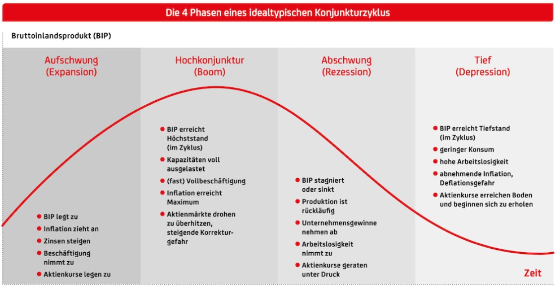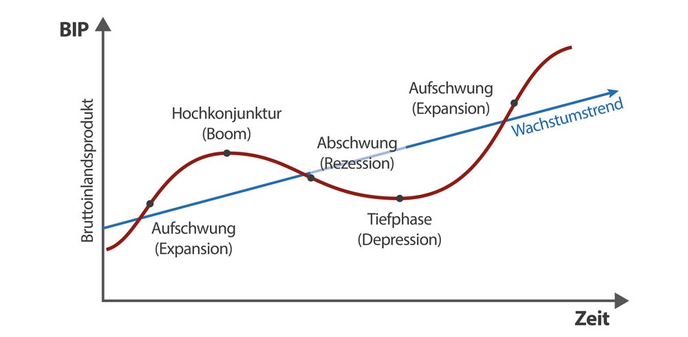 Die Konjunktur gibt Auskunft über die wirtschaftliche Lage eines Landes. Die wirtschaftliche Lage eines Landes verläuft in Wellenbewegungen, die als Konjunkturschwankungen bezeichnet werden. Ein idealtypischer Konjunkturzyklus sieht folgendermaßen aus: